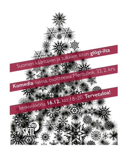 Tervetuloa Suomen kääntäjien ja tulkkien liiton järjestämään verkostoitumis- ja glögi-iltaan Komedia-saliin (Meritullinkatu 33, 2. krs.) keskiviikkona 16.12.2015 kello 18–20.