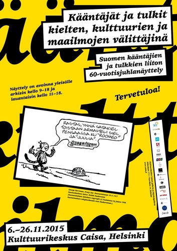 – Kääntäjät ja tulkit kielten, kulttuurien ja maailmojen välittäjinäPaikka: Kulttuurikeskus Caisa, Mikonkatu 17 C / Vuorikatu 14, Helsinki Vapaa pääsy Suomen kääntäjien ja tulkkien liitto täyttää tänä vuonna 60 vuotta, ja juhlistaa sitä tuomalla koko kääntäjien ja tulkkien ammattikuntaa aikaisempaa näkyvämmin esille. Vuosi huipentuu juhlavuosinäyttelyyn Kulttuurikeskus Caisassa 6.-26.11.2015. KUTSU Näyttely esittelee kääntäjien monipuolista työnkuvaa sekä työn haasteita muuttuvassa, monikulttuurisessa maailmassa hyödyntäen runsaasti erilaista käännös- ja tulkkausalaan liittyvää materiaalia. Mukana on alaan liittyviä videoita ja tallenteita, jotka tuovat näkyviin kääntäjien työtä käytännössä. Vierailijat pääsevät tarkastelemaan lähemmin esimerkiksi suomentajien ja av-kääntäjien työtä ja sitä kuinka merkittävä vaikutus kääntäjillä on suomalaisten kulttuuriseen kehitykseen ja identiteettimme rakentumiseen. Näyttelyssä havainnollistetaan myös sarjakuvakääntäjien työtä. Suomen kääntäjien ja tulkkien liiton juhlavuosinäyttelyn kanssa yhteistyössä esitettäviä muita näyttelyitä ovat kuvataidetta, kuvakirjateoriaa ja käännöstiedettä käsittelevä Kohtaamisia, sekä Sivuvalo-hankkeen Mutanttikieltä-näyttely. Tapahtumaan liittyy myös Kaisa Koskisen ja Outi Paloposken teoksen Sata kirjaa, tuhat suomennosta – kaunokirjallisuuden uudelleenkääntäminen (SKS, 2015) -julkaisutilaisuus 19.11. ja näyttelyn yhteydessä järjestetään Mutanttikieltä-piknikklubi, jossa esitellään kielen käännöksiä ja sanojen akrobatiaa 5.11. Lisäksi keskeisenä osana SKTL:n juhlavuosinäyttelyä järjestetään alaan liittyvä työpaja- ja luentosarja torstai-iltaisin klo 17-19 ja lauantaisin päivällä. Luennot käsittelevät uusia käännöksiä, suomennosklassikoita tuoreista näkökulmista, erilaisia tekijöitä käännösalalla sekä ammatin arvostusta. Yksityiskohtia tulossa pian!