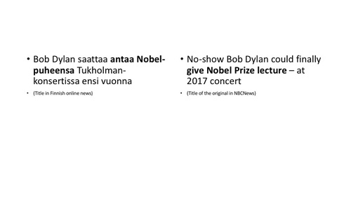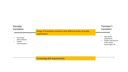 Minna KumpulainenLectio praecursoria, 5 December, 2016, University of Eastern Finland “Just translate” is a sentence which translators hear from their clients from time to time. This sentence annoys translators, because it usually means that they are expected to translate the text by switching the language, transferring the words in exactly the same order from the original to the translation, leaving no words out and adding nothing. This sentence reflects the extreme case of ignorance about the work of professional translators, but I dare to claim that the nature of their work and the skills involved in it are generally little known of or understood. People may wonder why translation needs to be studied at all, if one already can speak two languages – doesn’t that equal to being able to translate? Translation tasks are perhaps given to the girl next door who is good at English. After all, why pay a translator if she can do the same for half the price – or less. When I tell people that I teach translation, they sometimes ask me: Do you mean that you teach English? Or Finnish? No, I teach translation, which is a skill on its own. Why is it that the work of translators is so little known? Why is it that translation as a profession is undervalued, and the expertise and skills of a translator are not acknowledged? Everyday translation –––––––––––––– translators’ translation” (Continuum on a PowerPoint slide) One explanation may lie in the fact that translation is a diverse phenomenon. It is done for various purposes and in a wide range of situations, and the skills needed to translate in different situations vary tremendously. Not all translation in this world is carried out by translators. It cannot be and it does not have to be. Tuija Kinnunen has written about translation as almost a civic skill. She remarks that as the Finnish society is becoming more and more multinational, translation and interpreting are needed more than ever in everyday life and practices. All the people who have some level of knowledge and skills in two languages may also have to translate between these two languages, in freetime or as a part of their duties at work. Many of us have translated Finnish signs and pieces of instructions for tourists who do not understand Finnish. Or translated English texts to relatives or friends who do not understand English. Many bilingual children act as links between their monolingual parents and school, translating the messages sent from school to their parents and vice versa. I am sure that our Finnish students here at the university also do quite a bit of translating for the foreign students, since some relevant information is only available in Finnish. Nurses, pharmacists, the police, school and kindergarten teachers, priests, reporters, journalists, trainers, civil servants, bank clerks and others working in customer service carry out translation tasks in their work. This kind of translation is unexpected, and unplanned. It is INSTANT, on-the-spot translation, taking place whenever the need arises. It is perhaps more often spoken than written, but can involve written texts as well. Yet another, completely different type of translation is carried out in foreign language lessons at school. Most Finns, I believe, have translated chapters in their English or Swedish books into Finnish, or translated some sentences from Finnish into a foreign language. This type of translation has a specific purpose, that of teaching a foreign language and its characteristics. For this purpose, sentences are typically translated word for word, using the vocabulary list provided as the source of information. These kinds of translations are perhaps more familiar to people than the translation of translators. Therefore, they may also represent the whole field of translation to many people, to the extent that their understanding of the action is based on them. This understanding is correct, of course, but it is also necessarily one-sided and fragmentary. There are significant differences between the translation I just described and the translation typically carried out by a translator. If the multifaceted nature of translation is ignored and all translation is considered the same, the skills of a professional translator are bound to go unnoticed. Translation as an action could be compared to photography. Everyone with some level of language skills translates; everyone with a smartphone with an integrated camera takes pictures. However, taking pictures to be posted on Facebook or Instagram is one thing; and taking pictures for high-quality journals, newspapers or, other paying customers is another. Carrying a camera does not make anyone a photographer, no more than speaking two languages makes anyone a translator. A professional photographer not only carries a camera, but also knows the camera: what can be done with it in different circumstances and how it is all done. A professional uses different equipment depending on the type of photography: whether it is portraits, weddings, sports events, or landscapes. A professional chooses the settings according to the lighting. The whole photographing event is planned according to the purpose of the photos: a passport photo needs to meet different criteria than, for example, a portrait taken to mark a wedding anniversary. It takes a professional to know these criteria and to take pictures that actually meet the criteria. In the same way, a translator not only knows two languages, but also knows how to adjust the use of languages to meet the demands of different situations. A translator can produce quality translations when quality is needed. In on-the-spot translation, it is usually enough to make the participants to understand each other, one way or another. The purpose of translation is to enable communication or to keep it going. On-the-spot translation tolerates mistakes and ungrammatical language as long as the ma