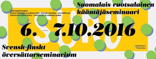 Tänään torstaina professori Pirkko Nuolijärvi pohtii, mikä on nykyään kääntämisen rooli Suomessa, Mikael Ekholm Valtioneuvoston kansliasta esittelee Suomen ruotsalaisen lakikielen uusia termejä, Pia Hansson Eläketurvakeskuksesta kertoo vuoden 2017 eläkeuudistukseen liittyvistä termeistä ja kielikonsultti Ingrid Herbert tutustuttaa seminaariyleisön verkon virkakieleen. Tänään ääneen pääsee myös kääntäjä Tarja Sirén, joka kertoo Strömsön kääntämisestä otsikolla Luppolipastosta palturipenkkiin. Perjantaina Maarit Koponen Turun yliopistosta kertoo seminaarissa konekäännöksen jälkieditoinnista Suomessa ja suomeksi ja Riina Klemettinen Kotimaisten kielten keskuksesta uudissanojen tallentamisesta ja hyödyntämisestä. Sunna Nygårdin ruotsinkielisessä puheenvuorossa esitellään ajankohtaisia kielikysymyksiä. Minna Levälahden aiheena ovat uudissanat mediassa. Fantasia- ja nuortenkirjailija Maria Turtschaninoff ja suomentaja Marja Kyrö kertovat päivän päätteeksi kirjailijan ja kääntäjän yhteistyöstä. Tutustu koko ohjelmaan täällä. “Kansainvälisen kääntäjienpäivän teema oli tänä vuonna kääntäminen ja tulkkaus maailmojen yhdistäjänä. Suomen- ja ruotsinkielinen maailma ovat jo niin lähellä toisiaan kuin kahden erilaisen kielen maailmat yleensä voivat olla, mutta silti väliin tarvitaan kääntäjiä ja tulkkeja kuromaan umpeen viimeinen este, ymmärtämättömyyden kuilu, joka voi aueta läheistenkin naapurusten välille”, totesi SKTL:n puheenjohtaja Heikki Karjalainen seminaarin avajaispuheenvuorossaan. Kotimaisten kielten keskus tutkii ja huoltaa suomea sekä ruotsia ja koordinoi saamen kielten, viittomakielten ja romanikielen lautakuntien työtä. Sen alaisuudessa toimiva Kielitoimisto neuvoo myös kansalaisia puhelimitse kielikysymyksissä. Suomen kääntäjien ja tulkkien liitto on ammattikääntäjien ja tulkkien aatteellinen etujärjestö, jonka jäseniä ovat kirjallisuuden kääntäjät, asiatekstinkääntäjät, av-kääntäjät, tulkit sekä käännös- ja tulkkausalalla toimivat opettajat ja tutkijat. Liitto pyrkii ajamaan koko ammattikunnan etuja, ohjeistaa alalla toimivia sekä käännöspalveluiden käyttäjiä ja edistää kääntämisen asemaa Suomessa. Suomalais-ruotsalaista kääntäjäseminaaria on järjestetty yli 40 vuotta, ensimmäistä kertaa Kouvolassa vuonna 1973. Seminaarin tehtävänä on nostaa esiin ajankohtaisia suomen ja ruotsin kieleen liittyviä kielikysymyksiä ja tukea molempien kotimaisten kielten kanssa työskenteleviä ammattilaisia. Lisätiedot: Seminaarityöryhmän jäsen, SKTL:n jäsensihteeri Jenni Kavén, 044 3445 205, jenni.kaven@sktl.fi SKTL:n tiedottaja Maarit Laitinen, 044 3445 111, maarit.laitinen@sktl.fi Suomalais-ruotsalainen kääntäjäseminaari Facebookissa Seminaarin kuulumisia voit seurata myös sosiaalisessa mediassa aihetunnisteilla #SuRu2016 ja #SuRuseminaari.