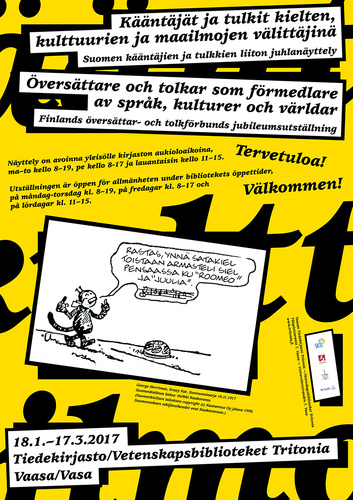Vad översätter en översättare? Vilka är översättarna och tolkarna? De här frågorna besvarar Finlands översättar- och tolkförbunds 60-årsjubileumsutställning, som lyfter på hatten åt översättarnas och tolkarnas arbete, som inte alltid är synligt. Vår utställning ser översättaren! Utställningen presenterar översättarnas och tolkarnas olika yrkesbilder och vad översättarna översätter. Huvudpersonerna är översättare och tolkar och med utställningen vi vill berätta hur mycket kreativitet, tålamod och kunskap arbetet som översättare och tolk i verkligheten kräver. Utställningen är öppen för allmänheten under bibliotekets öppettider, fritt inträde från måndag till torsdag kl. 8–19, på fredagar kl. 8–17 och på lördagar kl. 11–15. Översättare och tolkar som förmedlare av språk, kulturer och världar Finlands översättar- och tolkförbunds jubileumsutställning 18.1–17.3.2017 Vetenskapsbiblioteket Tritonia Universitetstranden 7, Vasa www.tritonia.fi Välkommen!