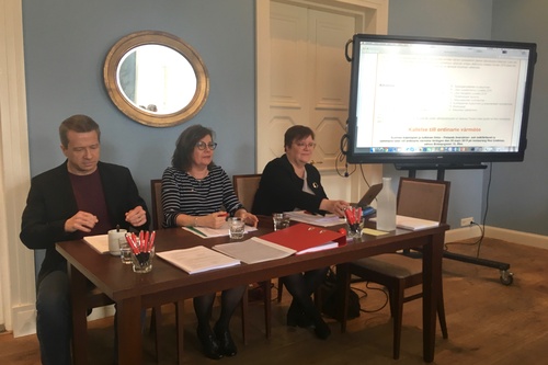 Vasemmalta oikealle: SKTL:n puheenjohtaja Heikki Karjalainen, kevätkokouksen puheenjohtajana toiminut Gun-Viol Vik sekä sihteerinä toiminut SKTL:n toiminnanjohtaja Kristiina Antinjuntti.