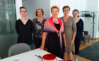 Vaasan paikallisosaston kakkukahvit kevätkokouksen yhteydessä. Kuvassa vasemmalta oikealle: Jonna Elomaa, Laura Lindén, Tarja Sirén, Annica Törmä ja Maria Larson. Kuva: Gun-Viol Storm
