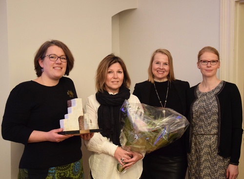 Olga Hirvirinne (toinen vasemmalta) vastaanotti palkinnon Tulkkilaki nyt -työryhmän puolesta SKTL:n syyskokouksessa. Kuvassa myös työryhmän edustaja Evelien Waegemans, tulkkijaoston puheenjohtaja Marjo Autioniemi ja Suvi Salmilampi tulkkijaoston toimikunnasta.