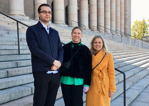 Oikealta vasemmalle: SKTL:n toiminnanjohtaja Jenni Kavénin kanssa kuulemisessa olivat mukana Suomen Kirjailijaliitto ry:n juristi Eeva Asikainen ja Suomen tietokirjailijat ry:n juristi Mikko Niemelä.
