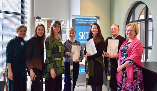 Vasemmalta oikealle: SKTL:n toiminnanjohtaja Jenni Kavén, Tarja Roinila -raadin puheenjohtajana toiminut Marja Ollila, SKTL:n hallituksen ja Tarja Roinila -raadin jäsen Pia von Essen, Tarja Roinila -stipendien saajat Emma Toukonen, Susanna Räty ja Mika Heiskanen sekä SKTL:n hallituksen puheenjohtaja Sanna Kokkonen.