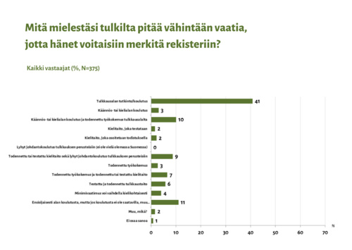 Kysely oli kohdistettu Suomessa toimiville puhuttujen kielten tulkeille, viittomakielen tulkeille, puhevammaisten tulkeille ja kirjoitustulkeille. Tällä hetkellä lainsäädäntö ei määrittele tulkkina toimivan ammattipätevyyttä, vaan tehtävässä voi toimia kuka tahansa missä tahansa. Tulkkien näkemyksen mukaan nykyinen ylimalkainen pätevyyden määrittely on heikentänyt tulkin ammatin arvostusta ja on jo johtanut koulutettujen tulkkien siirtymiseen pois tulkin ammatista. Tulkin ammattiroolia ei tunneta eikä sen merkitystä ymmärretä viestintätilanteissa. 43 % tulkeista on havainnut, että viranomainen tai muu julkishallinnon edustaja, kuten poliisi, TE-toimiston virkailija tai lääkäri, on käyttänyt asiakkaansa omaista (esimerkiksi sukulaista tai lasta) tulkkina ammattitulkin sijaan. Tällöin on vaarana se, että tulkkina toimivan kielitaito ja asiaosaaminen ei riitä tai viestintätilanteen eri osapuolien oikeusturva tai potilasturvallisuus vaarantuu. Lasta tulkkina käytettäessä rikotaan lapsen oikeuksia. 30 % kyselyyn vastanneista puhuttujen kielten tulkeista ja peräti 39 % oikeustulkeista on ollut tulkkina tilanteessa, jossa jotakin asiaa käsitellään uudestaan sen vuoksi, että asian jossakin käsittelyvaiheessa tulkkauksessa on ollut puutteita. Puutteet ovat voineet tarkoittaa esimerkiksi epäselvää tai virheellistä tulkkausta tai käännöstä. Sääntely edistäisi tulkkauspalvelun laatua Tulkit toivovat ammattipätevyyden tarkempaa määrittelyä ammatillisen asemansa ja eettisen toiminnan varmistamiseksi. Sääntely parantaisi yleisesti tulkkien ammattitaidon tasoa ja ylläpitämistä ja johtaisi tulkkauksen laadun paranemiseen. Ammattipätevyyden määrittely lain tasolla johtaisi todennäköisesti yhdenmukaisempaan ja luotettavampaan tulkkauspalveluun, mikä parantaisi asiakkaiden ja toimeksiantajien oikeuksia ja säästäisi julkishallinnon resursseja. Kyselyyn vastanneiden mielestä ammattipätevyyden määrittely pitäisi pohjata pääasiassa koulutukseen. Huolta kuitenkin aiheuttaa se, ettei kaikissa kielissä ole mahdollista hankkia koulutuksella ammattipätevyyttä Suomessa tai muuallakaan, jolloin olisi pohdittava, miten pienten ja harvinaisten kielten tulkkien tilanne ratkaistaan. Käytännössä ammattipätevyyden määrittely ei yksin takaa laatua, sillä tulkin ammattitaito koostuu kielen, kulttuurin ja yhteiskunnan tuntemuksesta sekä tulkkaustaidosta, joita kaikkia hiotaan ammattia harjoittamalla. Tieto ammatin perusteista ja eettisistä standardeista saadaan kuitenkin muodollisen koulutuksen kautta. 75 % vastaajista on sitä mieltä, että jos ammattipätevyyden määrittelyn yhteydessä perustettaisiin tulkkirekisteri, sen kulmakivenä olisi oltava ammatillisen pätevyyden todentaminen joko koulutuksen tai työkokemuksen perusteella. Kyselystä ilmenee, että epävarmuus vallitsevasta säädöspohjasta huolettaa tulkkeja. Jos niin sanottu tulkkirekisteri perustettaisiin, olisi huolehdittava siitä, että rekisterissä on alusta lähtien riittävästi tulkkeja ja että rekisteri on julkishallinnon työntekijöiden käytössä. Kyselyyn vastasi 375 tulkkia, joista 78 % toimii puhuttujen kielten tulkkeina. Asioimistulkkina toimii 88 % ja oikeustulkkina 34 % vastaajista. Kyselyn toteuttivat Suomen kääntäjien ja tulkkien liitto, Kieliasiantuntijat ja Suomen kielipalveluyritykset SKY. Tulosanalyysin teki Infontain Oy.