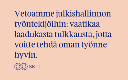 Kun voimme puhua äidinkieltämme, ilmaisemme itseämme täysin. Ammattitulkki pystyy välittämään tämän täyden ilmaisun oikein, tarkasti ja puolueettomasti kahden kielen ja kulttuurin välillä. Koulutettu ammattitulkki hallitsee työkielensä ja erikoissanastot, tuntee kulttuurien ja yhteiskunnan erityispiirteet ja noudattaa ammattietiikkaa. Sukulainen tai kieliä osaava maallikko tähän harvoin pystyy. Lasta ei pidä käyttää tulkkina koskaan. Jo ennen käynnissä olevia säästötoimia julkishallinnossa on ostettu halvinta mahdollista palvelua laadusta vain näennäisesti välittäen. Kilpailuttaja ei mieti sitä, voiko toiminta olla tosiasiallisesti kannattavaa kaikille hankintaketjussa ja mitä halvimman hinnan valinnasta seuraa tulkkauspalveluille ja julkishallinnon työntekijöille. Tämä on jo johtanut siihen, että koulutettuja asioimistulkkeja siirtyy muihin tehtäviin ja tulkkaus jää yhä useammin maallikoiden hoidettavaksi. Puutteellisen tulkkauksen vuoksi asioiden käsittelyssä voi syntyä viivästyksiä ja väärinkäsityksiä tai luottamus viranomaisia kohtaan rapautua. Säästöistä tuleekin kalliita. Varoittavia esimerkkejä löytyy jo muista Pohjoismaista. Vetoamme julkishallinnon työntekijöihin: vaatikaa laadukasta tulkkausta, jotta voitte tehdä oman työnne hyvin. Sanna Kokkonen puheenjohtaja, Suomen kääntäjien ja tulkkien liitto Erik Miller puheenjohtaja, SKY Suomen kielipalveluyritykset ry Ilona Repponen puheenjohtaja, Kieliasiantuntijat ry