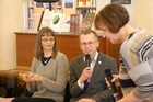 Virpi Hämeen-Anttila haastattelemassa Hollo-ehdokkaita. Kuvassa Raija Rintamäki ja Jyrki Kallio.