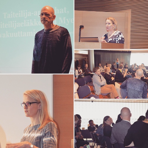 Tapaamisessa keskusteltiin muun muassa taiteilija-apurahojen tasosta, taiteilijaeläkkeistä ja Myel-vakuuttamisesta Kirjailijaliiton toiminnanjohtaja Suvi Oinosen (oikea ylälaita) alustuksella sekä freelancereiden sosiaaliturvasta ja työterveyshuollosta toiminnanjohtaja Elina Kuusikon (vasen alalaita) Suomen alustuksella. Suomen kääntäjien ja tulkkien liitto on Forum Artisin jäsenjärjestö. Tilaisuudessa SKTL:ää edusti puheenjohtaja Heikki Karjalainen.