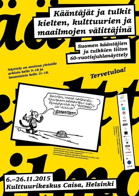 ![]() – Kääntäjät ja tulkit kielten, kulttuurien ja maailmojen välittäjinäPaikka: Kulttuurikeskus Caisa, Mikonkatu 17 C / Vuorikatu 14, Helsinki Vapaa pääsy Suomen kääntäjien ja tulkkien liitto täyttää tänä vuonna 60 vuotta, ja juhlistaa sitä tuomalla koko kääntäjien ja tulkkien ammattikuntaa aikaisempaa näkyvämmin esille. Vuosi huipentuu juhlavuosinäyttelyyn Kulttuurikeskus Caisassa 6.-26.11.2015. Näyttely esittelee kääntäjien monipuolista työnkuvaa sekä työn haasteita muuttuvassa, monikulttuurisessa maailmassa hyödyntäen runsaasti erilaista käännös- ja tulkkausalaan liittyvää materiaalia. Mukana on alaan liittyviä videoita ja tallenteita, jotka tuovat näkyviin kääntäjien työtä käytännössä. Vierailijat pääsevät tarkastelemaan lähemmin esimerkiksi suomentajien ja av-kääntäjien työtä ja sitä kuinka merkittävä vaikutus kääntäjillä on suomalaisten kulttuuriseen kehitykseen ja identiteettimme rakentumiseen. Näyttelyssä havainnollistetaan myös sarjakuvakääntäjien työtä. Suomen kääntäjien ja tulkkien liiton juhlavuosinäyttelyn kanssa yhteistyössä esitettäviä muita näyttelyitä ovat kuvataidetta, kuvakirjateoriaa ja käännöstiedettä käsittelevä Kohtaamisia, sekä Sivuvalo-hankkeen Mutanttikieltä-näyttely. Tapahtumaan liittyy myös Kaisa Koskisen ja Outi Paloposken teoksen Sata kirjaa, tuhat suomennosta – kaunokirjallisuuden uudelleenkääntäminen (SKS, 2015) -julkaisutilaisuus 19.11. ja näyttelyn yhteydessä järjestetään Mutanttikieltä-piknikklubi, jossa esitellään kielen käännöksiä ja sanojen akrobatiaa 5.11. Lisäksi keskeisenä osana SKTL:n juhlavuosinäyttelyä järjestetään alaan liittyvä työpaja- ja luentosarja torstai-iltaisin klo 17-19 ja lauantaisin päivällä. Luennot käsittelevät uusia käännöksiä, suomennosklassikoita tuoreista näkökulmista, erilaisia tekijöitä käännösalalla sekä ammatin arvostusta. Yksityiskohtia tulossa pian! Liitteet
