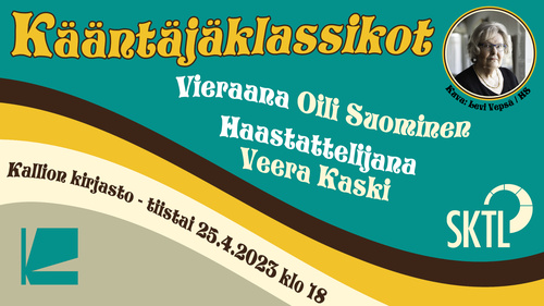 Usein kuulee puhuttavan klassikkokääntäjistä – kääntäjistä, jotka kääntävät klassikkokirjallisuutta – mutta nyt ääneen pääsevät kääntäjäklassikot – kääntäjät, jotka ovat likipitäen klassikkoja jo itsessään. SKTL:n kirjallisuuden kääntäjien jaosto järjestää yhteistyössä Kirjastokaistan ja Kallion kirjaston kanssa KÄÄNTÄJÄKLASSIKOT-sarjan, jossa pitkän linjan suomentajat kertovat urastaan ja kokemuksistaan vuosien varrelta. Sarja alkaa keväällä 2023 ja jatkuu jälleen syksyllä. Kääntäjäklassikot-sarjan ensimmäinen tilaisuus pidetään Helsingissä Kallion kirjaston kupolisalissa tiistaina 25.4. klo 18. Tällöin kunniavieraaksemme saapuu Oili Suominen, joka on yli 50-vuotisen suomentajanuransa aikana kääntänyt saksasta ja ruotsista mm. Günter Grassia, W. G. Sebaldia ja Grimmin satuja. Hän on saanut sekä Mikael Agricola -palkinnon että J. A. Hollon palkinnon, neljä valtionpalkintoa ja Pro Finlandia -mitalin. Oili Suomista haastattelee nuorempi kollega, saksasta suomentava Veera Kaski.
