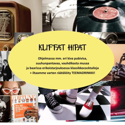 TAMPEREEN PAIKALLISOSASTON KLIFFAT HIPAT -PIKKUJOULUT FIFTARITUNNELMISSA Elvis has NOT left the building. Vuonna 1955 perustettu Suomen kääntäjien ja tulkkien liitto täyttää tänä vuonna 70 vuotta – ja SKTL:n Tampereen paikallisosasto järjestää sen kunniaksi kirjallisen ja viestintäväen verkottavat pikkujoulut eli KLIFFAT HIPAT fiftaritunnelmissa! Ilta alkaa kello 17.30 Early Bird -jäsenetkoilla ruuan äärellä. Jäsenetkojen jälkeen ilta jatkuu kello 19, kun saamme mukaan lisää osallistujia jäsenistöstä ja kiinnostavista sidosryhmistä kirjallisuus- ja viestintäaloilta: LINKKI KELLO 19 ALKAVAAN TAPAHTUMAAN. Ohjelmassa on eri kiva pubivisa, bingo, suuhunpantavaa, vauhdikasta musaa, Swing Team -tanssiseuran opastus rockabilly stroll -soolotanssiin, ja baarissa erikoistarjouksessa klassikkococktaileja + iltaamme varten räätälöity teemadrinkki! Muista myös myöhäisillan salapukkileikki: jos tuot säkkiin paketoidun kierrätyshenkisen lahjan, kuten kirjan tai muun lahjaksi sopivan esineen, saat vastaavasti myös itsellesi yllätyslahjan pukilta. Mitä ylle? Voit tulla omana itsenäsi vaikka suoraan työpöydän äärestä tai pukeutua halutessasi teeman mukaan! Brylcreemiä, dongareita, pallokuosia, Marimekkoa? Sinä päätät! Toivotamme tervetulleiksi kaikenlaiset fiftaritunnelmaa kohottavat vaatteet farkuista nahkapusakoihin ja kellohelmoista neuletakkeihin sekä ajan henkeen sopivat asusteet, punahuulet, helminauhat, kampaukset ynnä muut. Huomaa, että illan musiikki saattaa mennä jalan alle, eli tiukkoja kynähameita kannattaa välttää! :D AIEMMIN ILMOITTAUTUNUT EARLY BIRD: ILMOITTAUDU VIELÄ OHJELMAOSUUTEEN Early Bird -osallistujat ovat maksaneet jo osallistumisensa, mutta pyydämme myös näitä ”aikaisia lintuja” ilmoittautumaan (ilmoittautumisteknisistä syistä) vielä erikseen kello 19 alkavaan ohjelmaosuuteen (0 euroa) 26.11. mennessä: Ilmoittaudu tästä. |