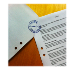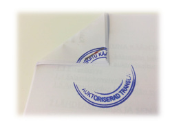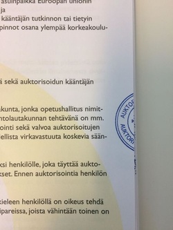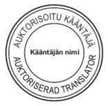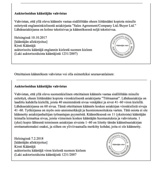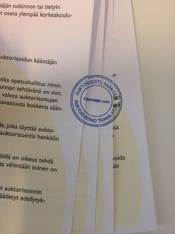 4.4 Käännöksen ja lähdeasiakirjan yhteen liittäminen Laillisesti pätevään käännökseen on ehdottomasti liitettävä lähdeasiakirja tai sen jäljennös. Asiakirjanipussa käännös on tavallisesti päällimmäisenä ja lähdeasiakirja alimmaisena. Liittäminen on tehtävä siten, että asiakirjoja ei voida erottaa toisistaan murtojälkiä jättämättä ja että on selvää, että nimenomaan kääntäjä on tehnyt liittämisen. Hyvä tapa on esimerkiksi yhteen liitettyjen asiakirjojen leimaaminen liitoskohdasta (ks. kuva jäljempänä ja alaluku 4.5.). Ellei auktorisoidulla kääntäjällä ole leimaa, sen tilalla voi käyttää allekirjoitusta, joka ulottuu liitoskohdan yli. Asiakirjalankaa on myös mahdollista käyttää silloin, kun asiakirjassa ja sen käännöksessä on useita kymmeniä sivuja. Hyvänä on pidettävä myös käännöksen sivujen numeroimista, jotta ne olisi vaikeampi erottaa toisistaan tai korvata. On tärkeää, että liittämisen tekee juuri kääntäjä, joka tietää, mistä asiakirjasta käännös on tehty. Digi- ja väestötietovirasto (ent. maistraatti) ja ulkoministeriö eivät voi laillistaa auktorisoidun kääntäjän vahvistamaa käännöstä, ellei kääntäjä ole liittänyt siihen lähdeasiakirjaa tai sen jäljennöstä, eikä ”irrallista” käännöstä välttämättä pidetä laillisesti pätevänä. On suositeltavaa, että asiakas varmistaa käännöksen vastaanottajalta, onko lähdeasiakirjan oltava esimerkiksi virallisesti vahvistettu tai oikeaksi todistettu jäljennös (ks. alaluku 2.1) ja onko lähdeasiakirja laillistettava. Jos lähdeasiakirjassa on esimerkiksi oltava apostille-todistus, se on haettava lähdeasiakirjaan jo ennen kääntämistä, jotta auktorisoitu kääntäjä voi liittää käännökseen nimenomaan laillistetun lähdeasiakirjan. Oikea ”marssijärjestys” on asiakkaan oikeusturvan kannalta erittäin tärkeä: jos liitetty lähdeasiakirja ei täytä vaatimuksia tai jos asiakas esittää viranomaiselle pätevän lähdeasiakirjan ja käännöksen toisistaan erillisinä asiakirjoina, viranomainen ei todennäköisesti hyväksy auktorisoidun kääntäjän vahvistamaa käännöstä vaan palauttaa asiakkaan kääntäjän luo. Tästä aiheutuu asiakkaalle luonnollisesti ylimääräistä vaivaa ja ajanhukkaa sekä pahimmillaan oikeudenmenetys, jos esimerkiksi määräajat ehtivät asiaa selviteltäessä kulua umpeen. Digi- ja väestötietovirasto DVV:n julkinen notaari neuvoo mielellään laillistamismenettelyyn liittyvissä kysymyksissä.
