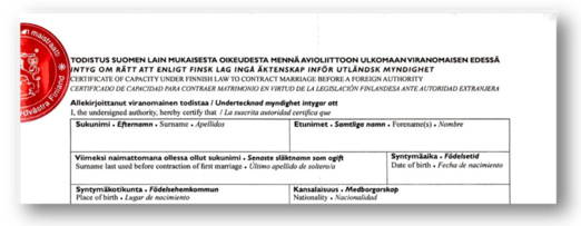 Jos kääntäjä ei pysty kääntämään jotain tekstikohtaa, se jätetään käännökseen samaan muotoon, jossa se on lähdeasiakirjassa, tai sen kohdalle merkitään esimerkiksi [tahra] tai [epäselvää tekstiä]. Tällaisista kohdista tehdään huomautus. Jos kyseessä on esimerkiksi kehno kieliasu, kääntäjä voi huomautuksessa mainita yksittäisten sanojen merkityksen tai esittää mahdollisen tulkinnan. 6.3 Kieli, jonka kääntämiseen kääntäjää ei ole auktorisoitu Jos lähdeasiakirjassa esiintyy kieltä, jonka kääntämiseen kääntäjää ei ole auktorisoitu, tällaiset tekstikohdat siirretään käännökseen sellaisinaan. Jos ne on kirjoitettu muilla kuin latinalaisilla aakkosilla, siirtämisen sijasta niiden kohdalle käännökseen voi kirjoittaa esimerkiksi: ”[kaksi riviä arabiankielistä tekstiä]” tai ”[kaksi riviä kääntäjälle tuntemattomalla kielellä kirjoitettua tekstiä]”. Huomautuksessa ilmoitetaan, että kääntäjällä ei ole oikeutta kääntää näitä tekstikohtia. Jos hän osaa kyseistä kieltä, hän voi kääntää kohdan huomautukseen, mutta silloin on mainittava, että käännöksen kyseinen kohta ei ole laillisesti pätevä. (Ks. alakohta 4.1. Käännöksen nimeäminen) Monikielisiä lomakkeita käännettäessä voidaan ”ylimääräiset” kielet jättää käännöksestä pois. Huomautuksessa ilmoitetaan, että lomakkeessa on samansisältöiset vakiotekstit usealla eri kielellä, mutta käännös perustuu esimerkiksi suomenkieliseen tekstiin ja muut kielet on jätetty huomiotta.