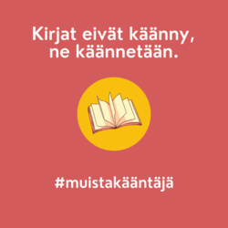Lehdissä, blogeissa, mainoksissa, sosiaalisessa mediassa ja muissa yhteyksissä kirjoitetaan paljon kirjoista ja kirjallisuudesta. Se on hienoa! Käännöskirjallisuudesta kirjoittaessa teksteissä tulisi kuitenkin aina muistaa mainita eräs olennainen tieto: kääntäjän nimi. Kääntäjä on kirjan toinen tekijä, ja hänellä on tekstiinsä tekijänoikeus. Kirjailija on luonut alkuteoksen omalla kielellään, mutta suomennoksen sanavalinnat ja lauserakenteet ovat suomentajan käsialaa. Suomentajan pitää olla vahva tulkitsija ja monipuolinen ja luova kielenkäyttäjä, joka tietää, miten kirjoja kirjoitetaan. Jos kaksi eri kääntäjää kääntää saman tekstin, tulos on aina erilainen. Siksi on tärkeää tietää, kenen kynästä käännös on lähtöisin. Jos käännöstä siteerataan, sitaatin yhteydessä on tekijänoikeuslain mukaan mainittava kirjailijan lisäksi myös kääntäjän nimi. Lisäksi aikana, jona kuluttaja voi epähuomiossa tilata netistä käyttökelvottoman konekäännöksen, suomentajan nimen mainitseminen on myös lukijan palvelemista. Ammattisuomentajan nimi kirjassa on laadun tae. Suomen kääntäjien ja tulkkien liiton ja Kääntäjien ammattiosasto KAOS ry:n Muista kääntäjä! -kampanjan tarkoituksena on muistuttaa kääntäjien merkityksestä ja tekijyydestä. Kampanjan kuvia ja tekstejä saa kopioida ja lainata vapaasti. Niitä voi jakaa sosiaalisessa mediassa tai lähettää eteenpäin esimerkiksi silloin, jos havaitsee, että kääntäjän nimi on jossain olennaisessa yhteydessä jäänyt mainitsematta. Kiitos, kun muistat kääntäjän!#muistakääntäjä