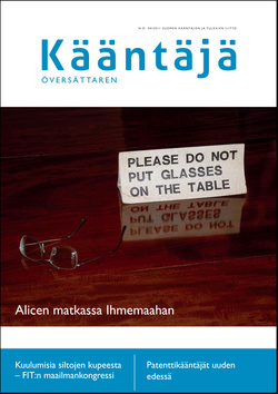 3/2011Tekijänoikeutta etsimässä – asiatekstinkääntäjät, av-kääntäjät ja tulkit / KäTu2011 – monitieteisyyden lumoa / Aikamatkalla alluusioiden kanssa / Das Leben ist eine Übersetzung (Elämä on kääntämistä) / Tulkkauksen laaduntekijät Andalusiassa / Uljas Attila -palkinto Arkkitehtitoimisto Pekka Helin & Co Oy:lle / ESKOsta apua parempaan sääntelyyn / Yrittäjän ammattitutkinto / Av-kääntäjän työstä – ruotsalaisen av-kääntäjän näkökulma / Agricola- ja Hollo-voittajat juhlivat Turussa / 11 kysymystä kääntäjälle – Kirsi Kinnunen / Straelenin kääntäjätalo / Sääntömääräinen kevätkokous