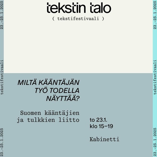 Miltä kääntäjän työ todella näyttää? Tervetuloa seuraamaan kääntäjää työssään! Oletko koskaan miettinyt, millaista kääntäjän työ on? Siitä pääsee ottamaan selvää Tekstin talon Tekstifestivaaleilla, kun Suomen kääntäjien ja tulkkien liiton jäsenet kääntävät erilaisia tekstejä ja teoksia katsojan silmien edessä. Kello 15–17 paikalla on kirjallisuuden kääntäjä, jota voit samalla haastatella kirjallisuuden kääntämiseen liittyvistä asioista. Kello 17–18 paikalla on av-kääntäjä, joka esittelee av-käännöstyökaluja. Kello 18–19 voit tutustua asiatekstinkääntämisen saloihin ja tutustua käännösmuistien toimintaan. Kääntäjän kanssa rupattelu on myös sallittua! Tutustu Tekstifestivaalien muuhun ohjelmaan täällä.