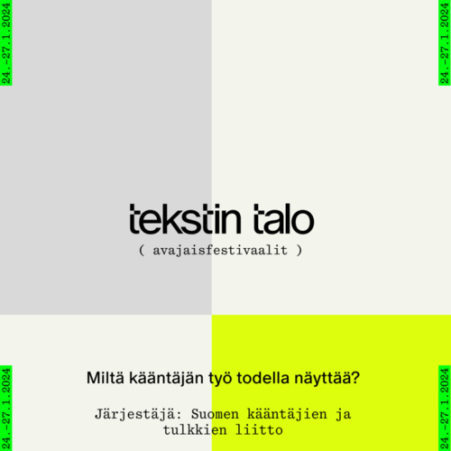 Tervetuloa seuraamaan kääntäjää työssään! Oletko koskaan miettinyt, millaista kääntäjän työ on? Siitä pääsee ottamaan selvää Tekstin talon avajaisfestivaaleilla, kun Suomen kääntäjien ja tulkkien liiton jäsenet kääntävät erilaisia tekstejä ja teoksia katsojan silmien edessä. Kääntäjän kanssa rupattelu on myös sallittua! Vapaa pääsy. Tapahtuma on osa Tekstin talon avajaisfestivaalia. Avajaisfestivaalien koko ohjelman löydät täältä. |