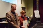 Puheenjohtaja Heikki Karjalainen ojensi syykokouksessa Mary Nurmiselle 40-vuotisjuhlarahaston stipendin.