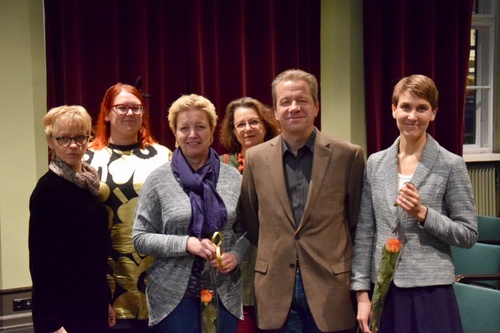 Hallituksen jäseniä kuvassa vasemmalta oikealle: Ruta Rannat (IV jaoston edustaja), Anna-Maija Ihander (III jaoston vt. pj. vuonna 2018), Tarja Sirén (Vaasan paikallisosaston edustaja), Ruth Jakobson (II jaoston edustaja vuonna 2018), puheenjohtaja Heikki Karjalainen ja Marja Ollila (II jaoston edustaja vuonna 2019).