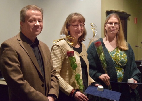 Puheenjohtaja Heikki Karjalainen ojensi syyskokouksessa Leena Salmelle (keskellä) kultaisen ansiomerkin ja Minna Ruokoselle hopeisen ansiomerkin.