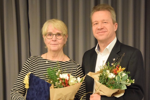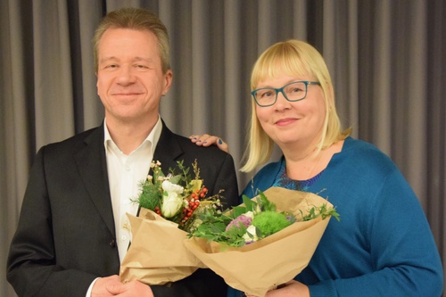Liiton uusi puheenjohtaja Sirpa Alkunen sekä väistyvä puheenjohtaja Heikki Karjalainen.