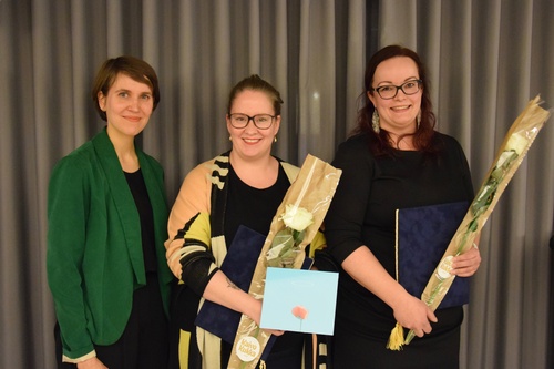 Kuvassa oikealta vasemmalle: Elina Eskola, Kaisu Keisala-Kaseja sekä asiatekstinkääntäjien jaoston puheenjohtaja Marja Ollila.