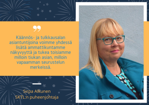 Hyvää vuotta 2020, hyvät SKTL:n jäsenet!Aloitan nyt vuodenvaihteessa pestini Suomen kääntäjien ja tulkkien liiton hallituksen puheenjohtajana innostuneena, kiinnostuneena ja hyvillä mielin. Toivon myös tapaavani mahdollisimman monia teistä jäsenistämme kaksivuotisen kauteni aikana. Liiton toiminta on vahvasti yhteistyötä. Pyrkimyksenäni on lisätä yhteistyötä myös jaostojen ja paikallisosastojen välillä, jotta jäsenet saisivat mahdollisimman paljon irti mielestäni parhaasta jäsenedustamme: monipuolisesta kollegajoukosta. Menestyksellä käynnistettyä mentoritoimintaa jatketaan tänä vuonna, ja tulossa on myös yrittäjäkoulutusta käännösyrittäjyyttä harkitseville tai äskettäin aloittaneille. Jaostot ja paikallisosastot järjestävät monenlaista ohjelmaa jäsenille pitkälti upeiden vapaaehtoistemme voimin. Kannattaa siis vilkuilla liiton sivuilta löytyvää tapahtumakalenteria sekä seurata liiton ilmoittelua somessa. Toimisto antaa tarvittaessa lisätietoja. Loppuvuodesta 2020 järjestetään alamme suurin tapahtuma eli FIT:n maailmankongressi Kuuban Varaderossa. Matkaa varten voi jo hakea Kopiosto-apurahaa, joten koko reissua ei tarvitse välttämättä pulittaa omasta lompakosta. Mielenkiintoisen ohjelman lisäksi kongressissa on mahdollisuus tutustua kollegoihin kaikkialta maailmasta. Paljon, paljon kiinnostavaa on siis tiedossa! Tietenkin hallituksessa, toimistossa ja jaostoissa myös seuraamme alan kehitystä ja reagoimme asioihin tarvittaessa. Käännös- ja tulkkausalan asiantuntijoina voimme yhdessä lisätä ammattikuntamme näkyvyyttä ja tukea toisiamme milloin tiukan asian, milloin vapaamman seurustelun merkeissä. Menestystä uudelle vuodelle, ja nähdään tapahtumissa! - terveisin