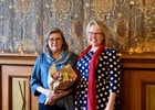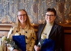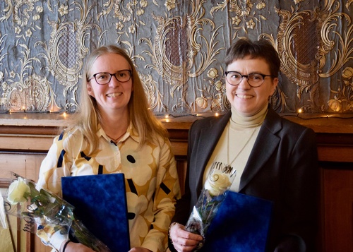 Vasemmalta oikealle: Annika Rikberg-Grannakselle myönnettiin kokouksessa hopeinen ja Annica Törmälle kultainen ansiomerkki.