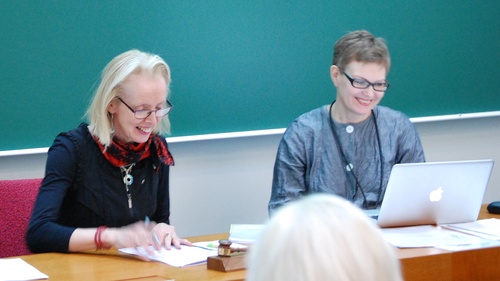 Liiton puheenjohtaja Kristiina Antinjuntti (oik.) pitämässä tervetuliaispuheen.