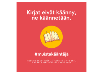 ![]() Lehdissä, blogeissa, mainoksissa, sosiaalisessa mediassa ja muissa yhteyksissä kirjoitetaan paljon kirjoista ja kirjallisuudesta. Se on hienoa! Käännöskirjallisuudesta kirjoittaessa teksteissä tulisi kuitenkin aina muistaa mainita eräs olennainen tieto: kääntäjän nimi. Kääntäjä on kirjan toinen tekijä, ja hänellä on tekstiinsä tekijänoikeus. Kirjailija on luonut alkuteoksen omalla kielellään, mutta suomennoksen sanavalinnat ja lauserakenteet ovat suomentajan käsialaa. Suomentajan pitää olla vahva tulkitsija ja monipuolinen ja luova kielenkäyttäjä, joka tietää, miten kirjoja kirjoitetaan. Jos kaksi eri kääntäjää kääntää saman tekstin, tulos on aina erilainen. Siksi on tärkeää tietää, kenen kynästä käännös on lähtöisin. Jos käännöstä siteerataan, sitaatin yhteydessä on tekijänoikeuslain mukaan mainittava kirjailijan lisäksi myös kääntäjän nimi. Lisäksi aikana, jona kuluttaja voi epähuomiossa tilata netistä käyttökelvottoman konekäännöksen, suomentajan nimen mainitseminen on myös lukijan palvelemista. Ammattisuomentajan nimi kirjassa on laadun tae. Suomen kääntäjien ja tulkkien liiton ja Kääntäjien ammattiosasto KAOS ry:n Muista kääntäjä! -kampanjan tarkoituksena on muistuttaa kääntäjien merkityksestä ja tekijyydestä. Kampanjan kuvia ja tekstejä saa kopioida ja lainata vapaasti. Niitä voi jakaa sosiaalisessa mediassa tai lähettää eteenpäin esimerkiksi silloin, jos havaitsee, että kääntäjän nimi on jossain olennaisessa yhteydessä jäänyt mainitsematta. Kiitos, kun muistat kääntäjän!